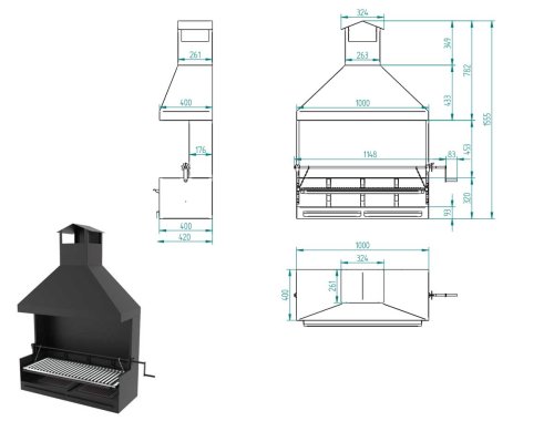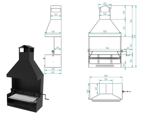 Konstrukcija pagaminta iš tvirto plieno, kurio storis siekia iki 4 mm, užtikrinant patikimumą ir atsparumą intensyviam naudojimui. Įrenginys turi išimamus pelenų stalčius, kurie leidžia lengvai palaikyti švarą, bei integruotą kaminą su dūmtraukiu efektyviam dūmų šalinimui.